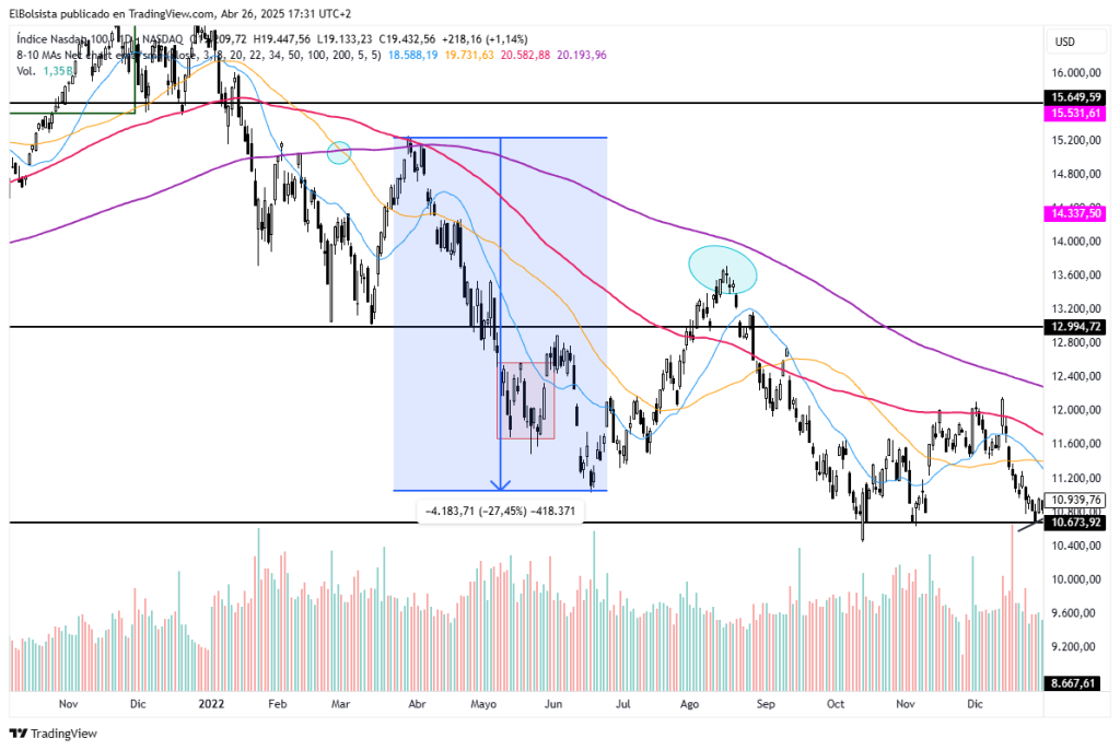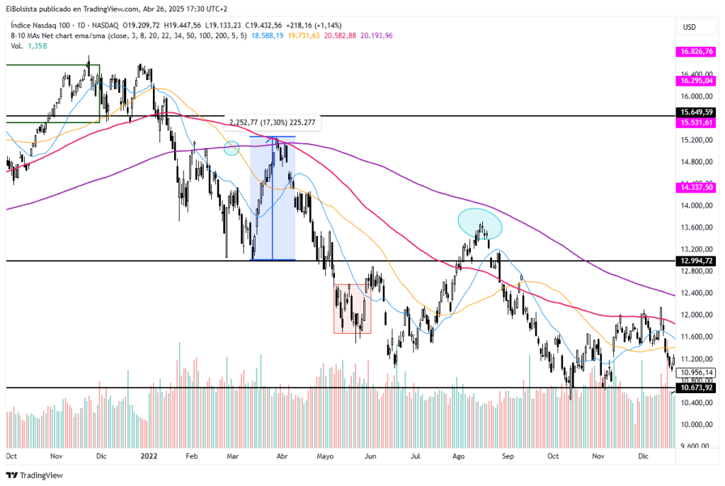 La última vez que vimos este cruce (marzo de 2022), el Nasdaq subió inicialmente un 17%… para luego caer un 27% en apenas dos meses y medio.