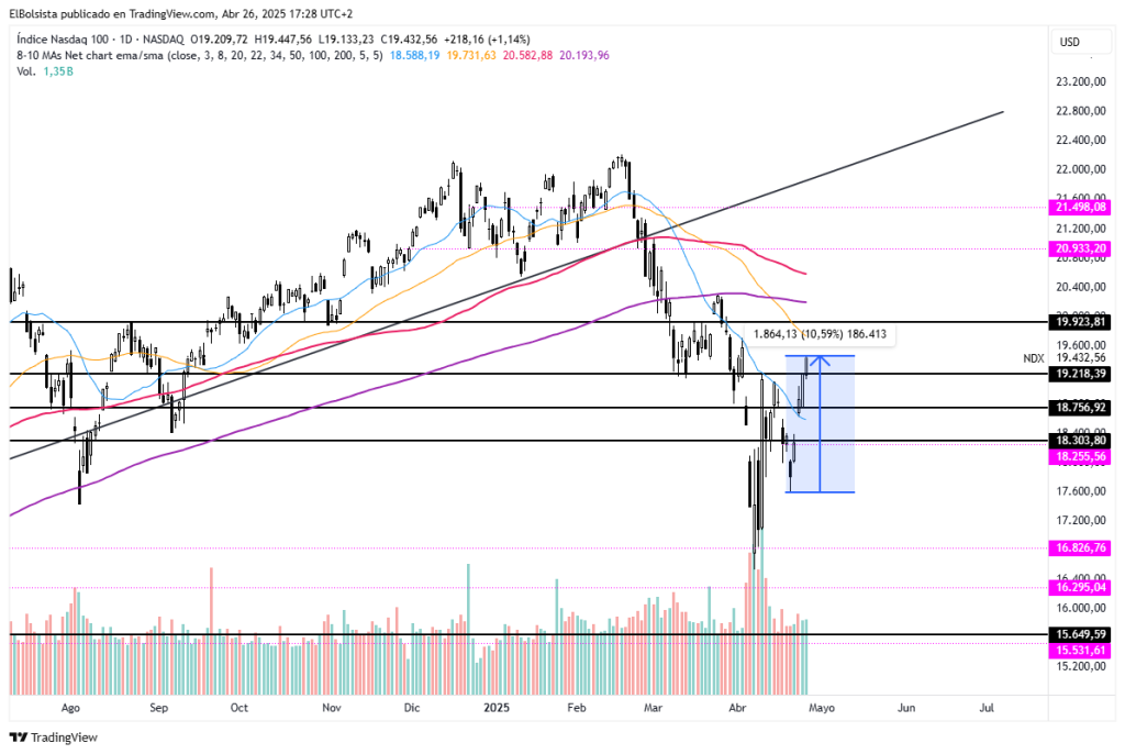 Además, ayer cerró por encima de los 19.218 puntos, una resistencia que no había podido superar en la sesión de la gran subida del otro día. Esta vez sí la ha roto, y no solo eso: el precio también se ha colocado por encima de la media de 20 sesiones en el gráfico diario.